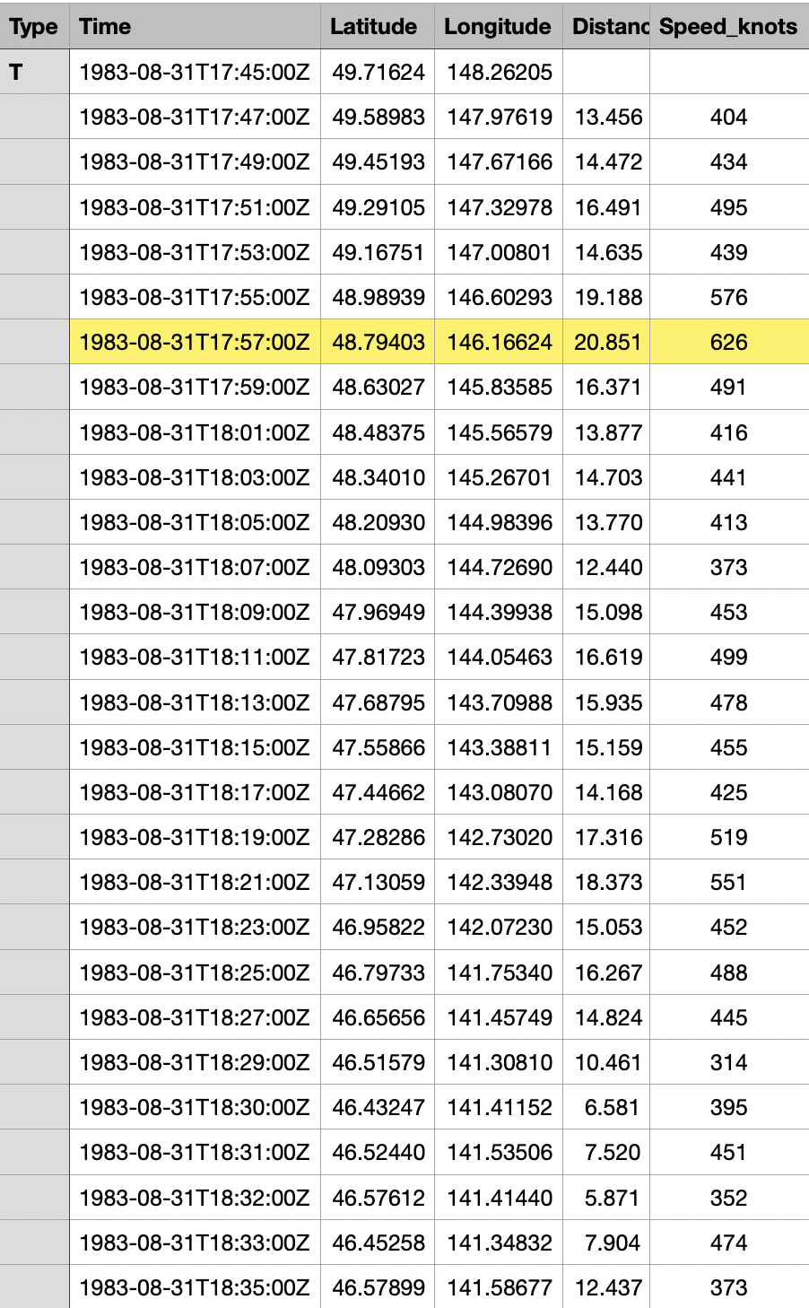 Once again there are significant speed changes from 373 to 623 knots, again not actions of an innocent passenger aircraft. There are also times when the maximum speed of a 747 of 533knots is exceeded suggesting the aircraft shown is not KAL007.
